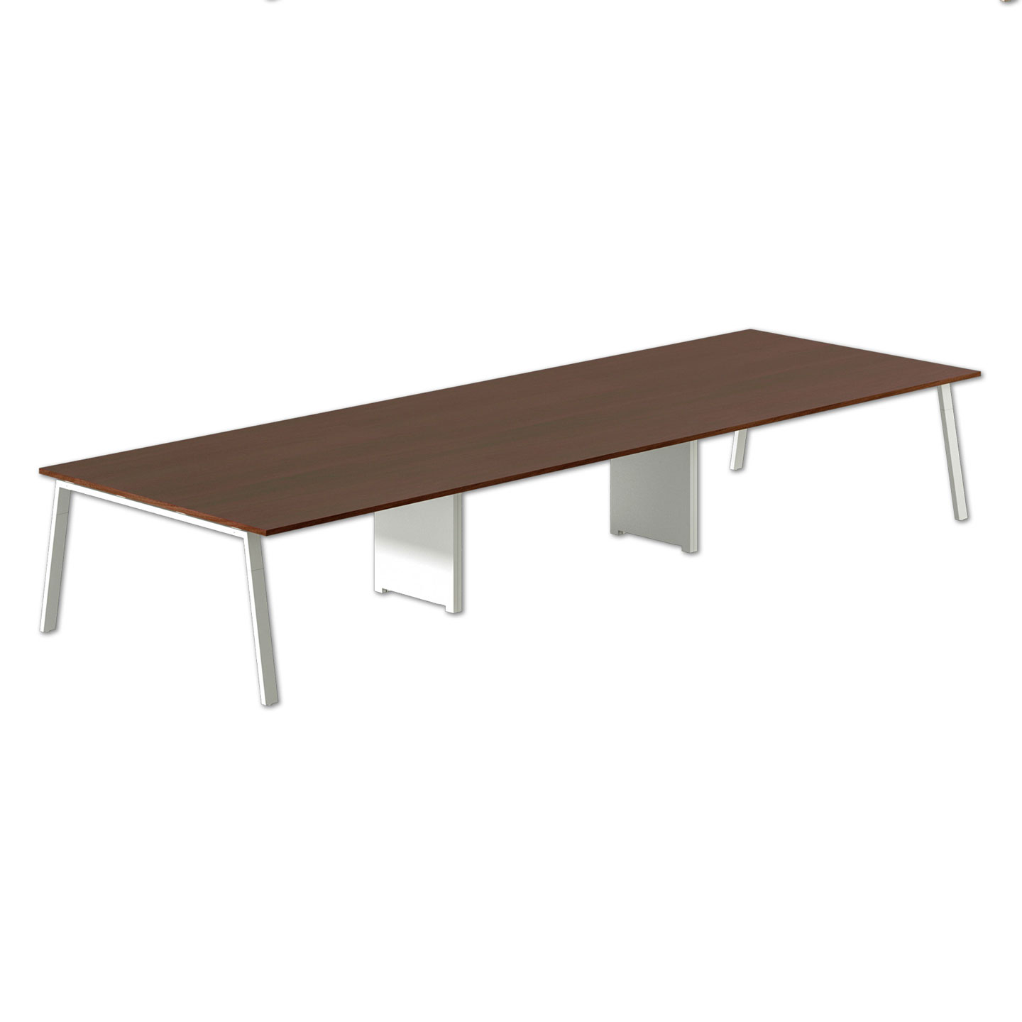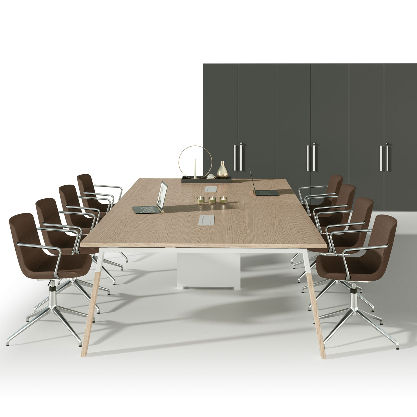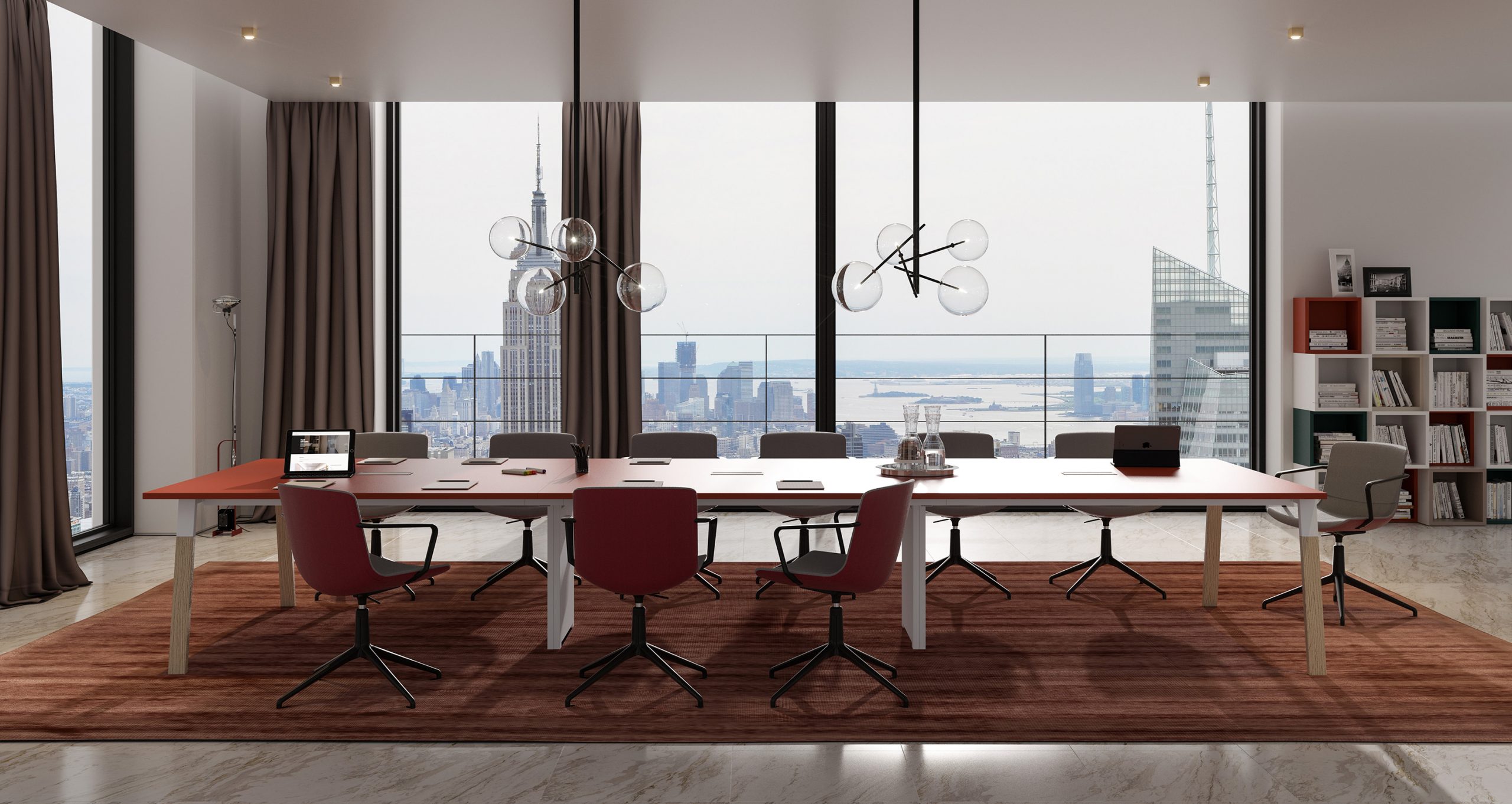 Il sistema di scrivanie operative comprende anche una serie di tavoli per riunioni di design. In questo caso, alla gamba centrale può essere aggiunto un charter per la risalita dei cavi, davvero essenziale per mantenere l’ambiente in perfetto ordine.