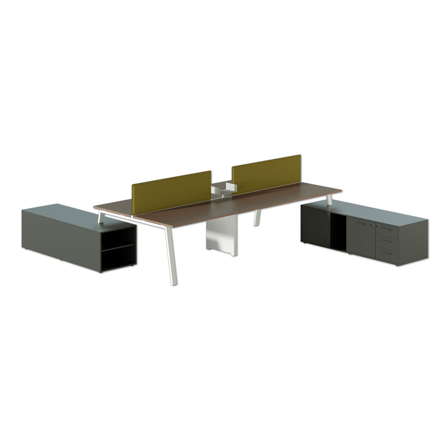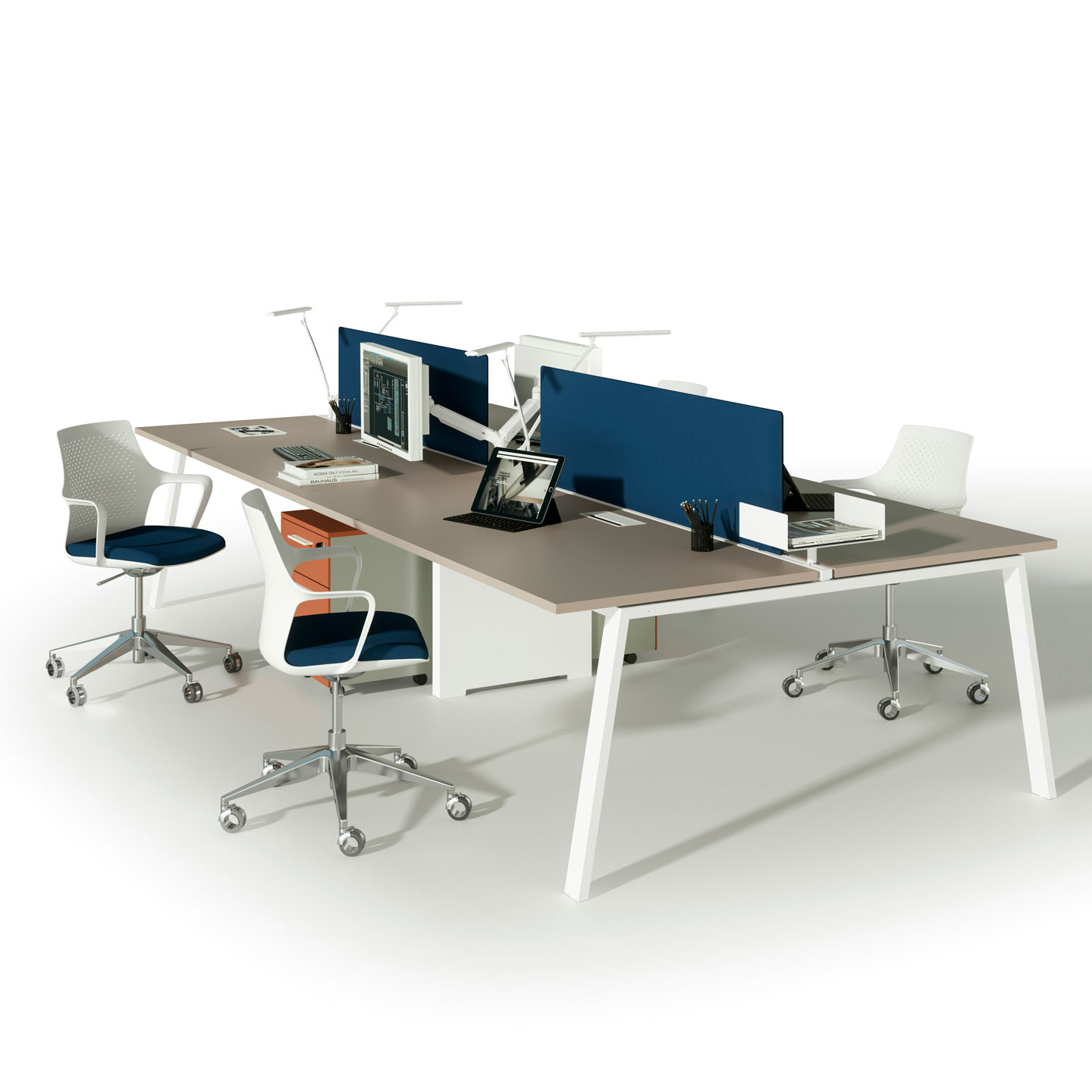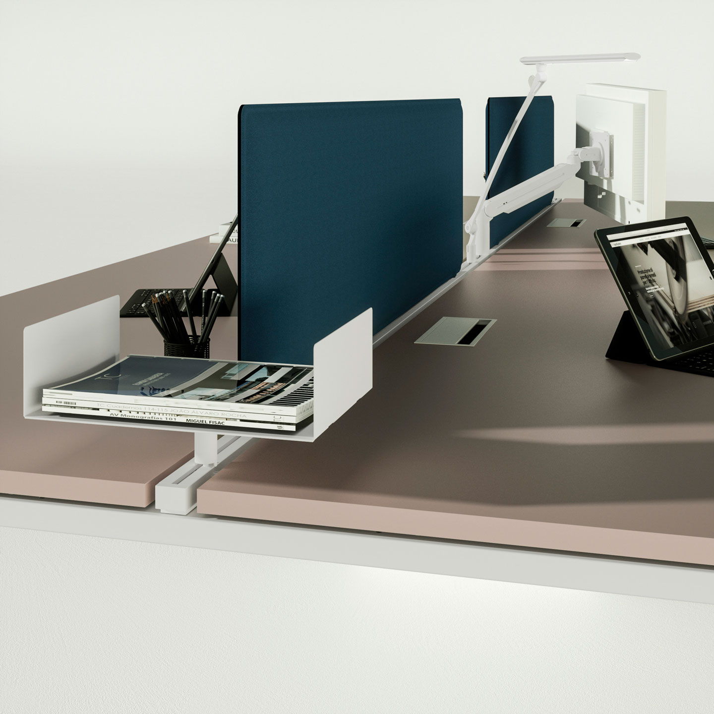 Le postazioni condivise sono arricchite da numerosi accessori che possono essere integrate al binario centrale. Passacavi, top access, accessori elettrificabili, vaschette, vertebre, porta pc e pannelli screen permettono di personalizzare il proprio spazio