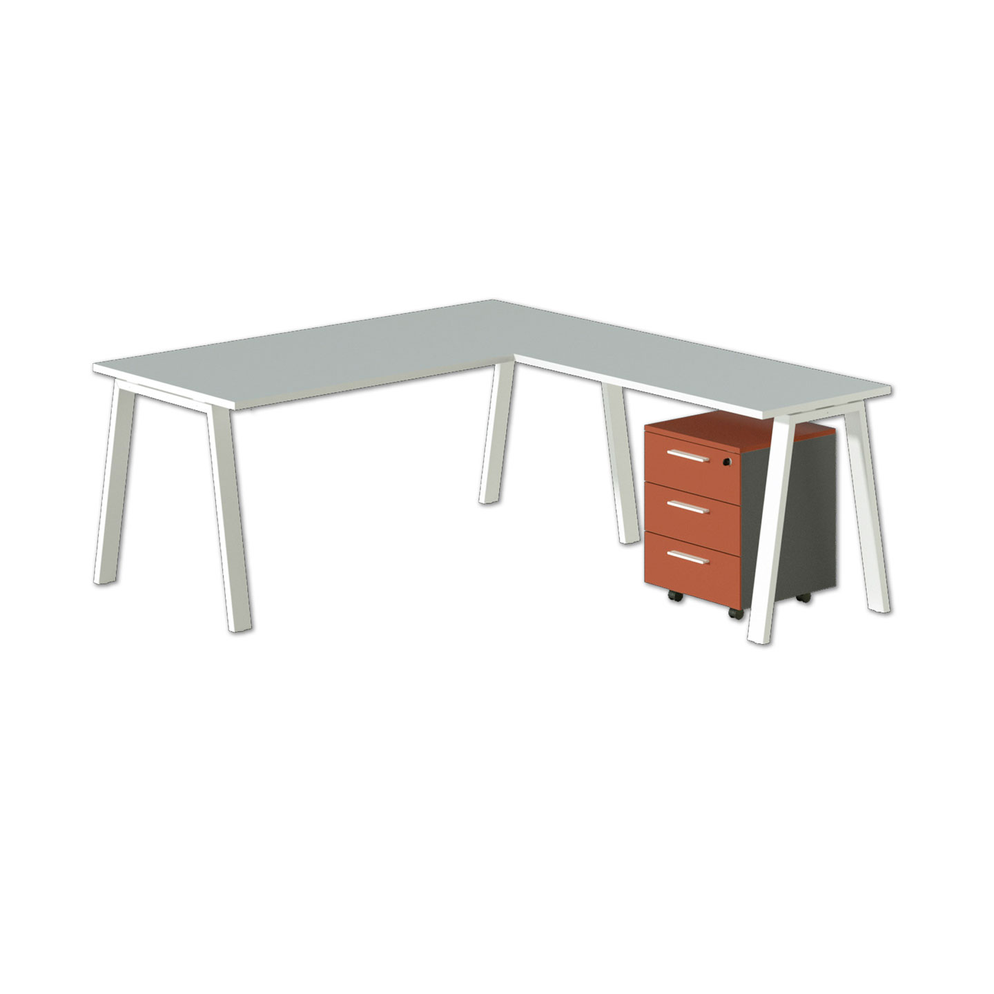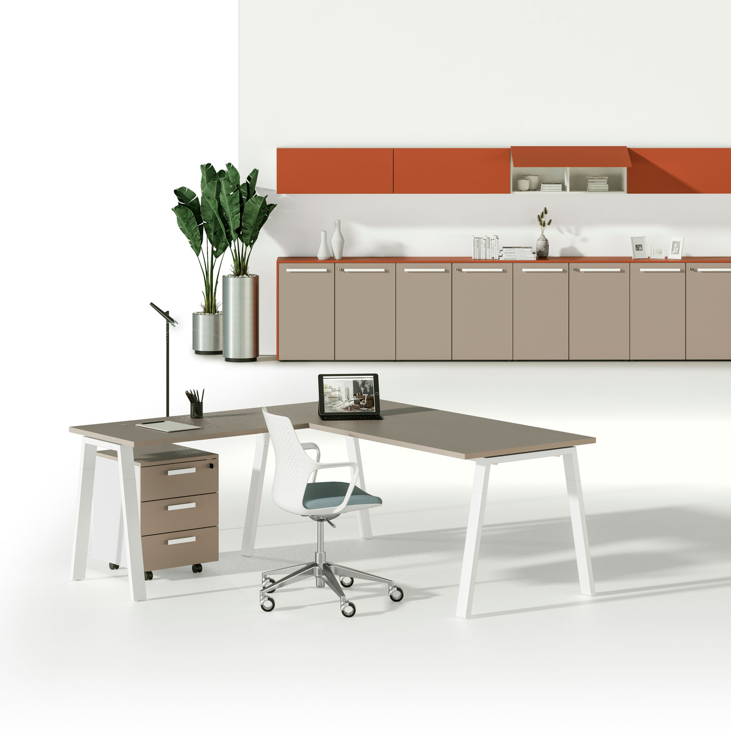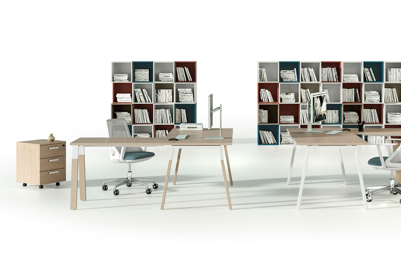 Le scrivanie ALPHA sono dotate di gamba metallica a cavalletto davvero originale, in metallo o con inserto in legno massello rovere chiaro per il modello ALPHA WOOD, per rendere unico ogni spazio di lavoro.