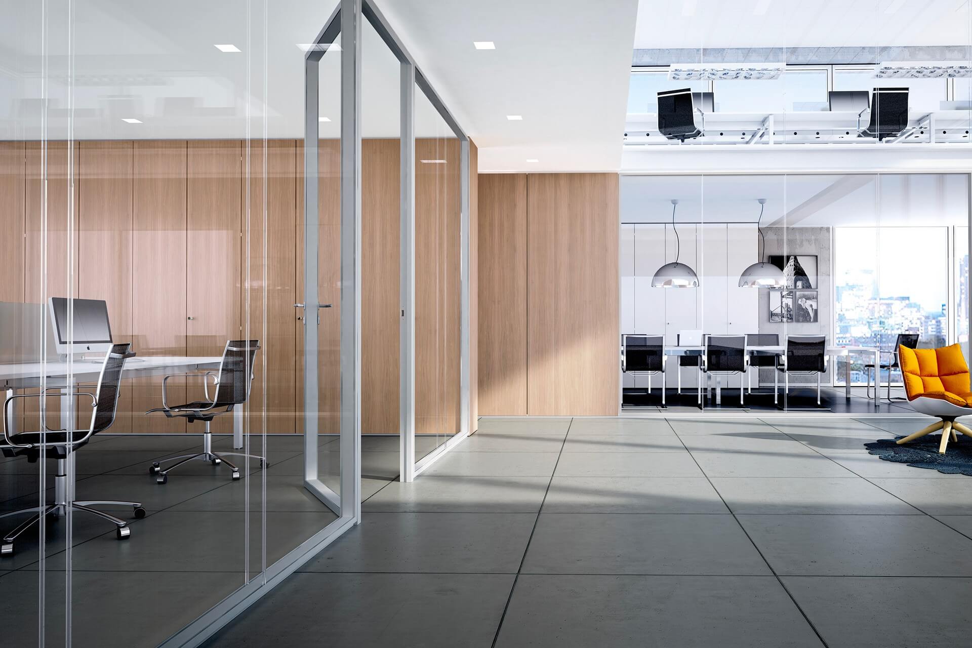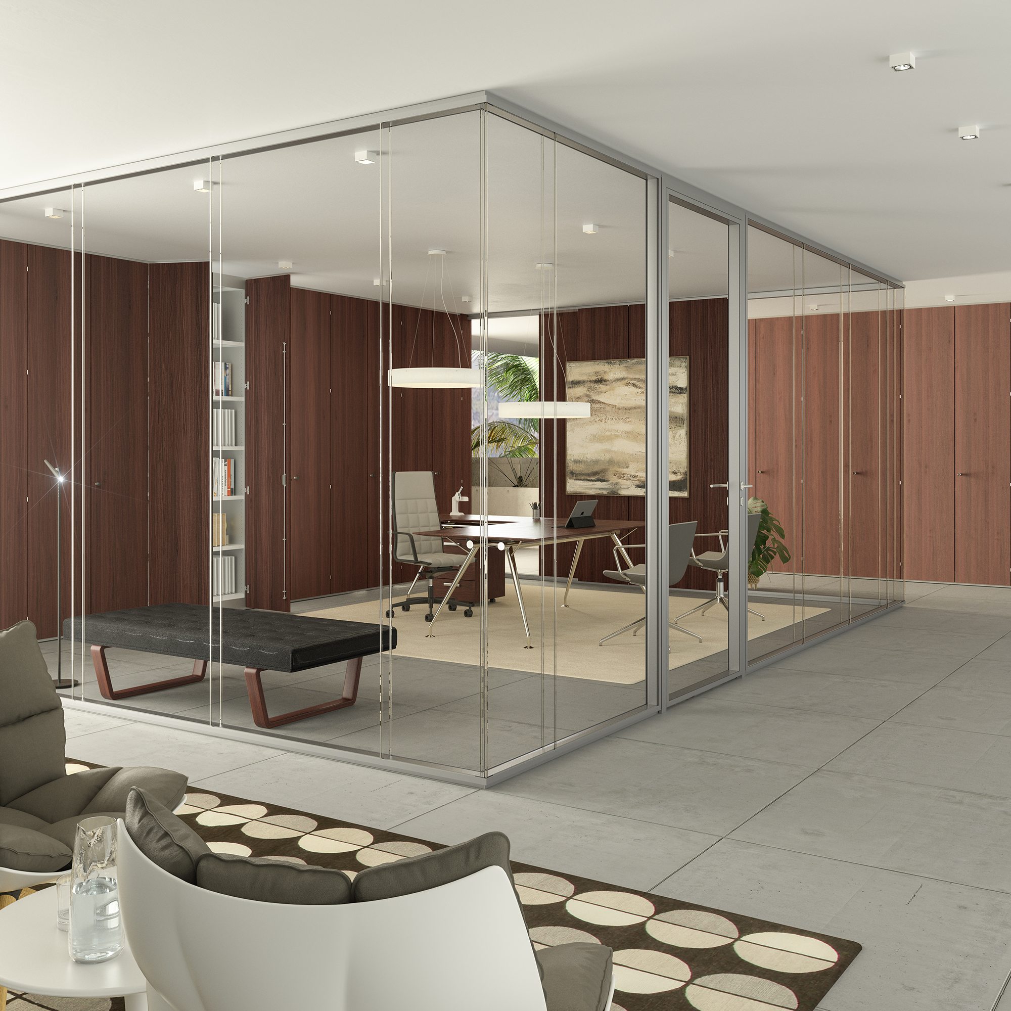 La parete Biglass è caratterizzata dalla configurazione a vetro doppio; dialogo tra luce, trasparenza, riflessi e architettura. Biglass è un sistema eclettico, che può organizzare aree manageriali, zone operative, sale riunioni, spazi collettivi e d’accoglimento. La parete Biglass è indicata ovunque siano richieste prestazioni acustiche particolarmente alte, senza necessariamente dover rinunciare all’estetica.