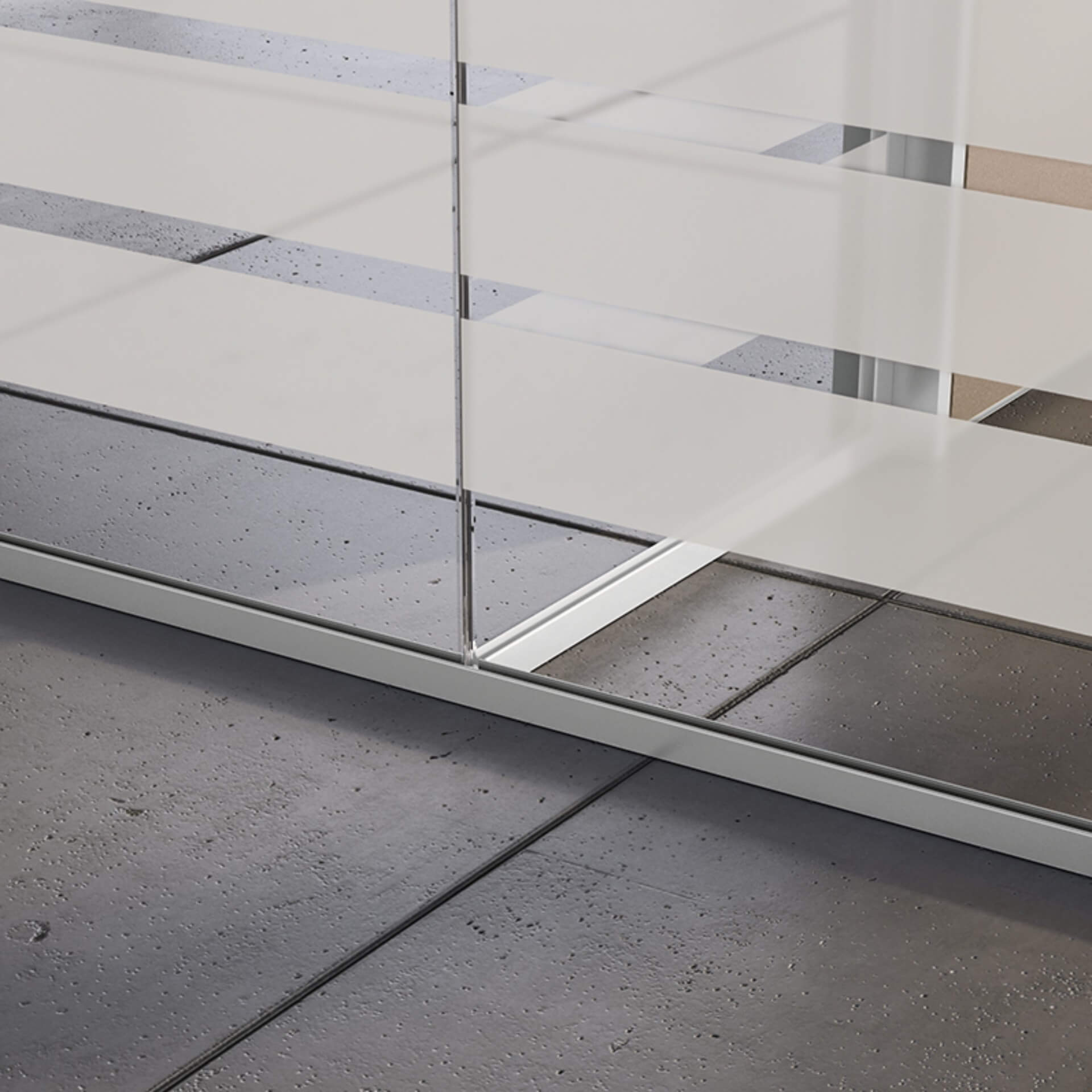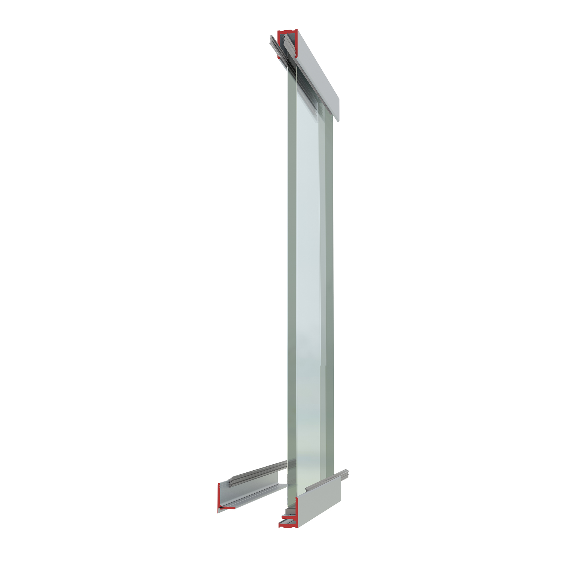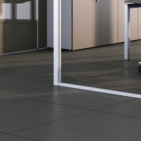 Versione con profili sia a pavimento che a soffitto con sezione p.21 x h. 30 mm; parti vetrate con vetri di spessore 10 o 12 mm. Le giunzioni dei vetri sono realizzate con adeguati profili in policarbonato trasparente. Porte a battente (sia in cristallo che in legno). La parete Essentia light, grazie ai profili in alluminio di ridotte dimensioni, è il prodotto ideale per chi cerca un estetica minimalista.